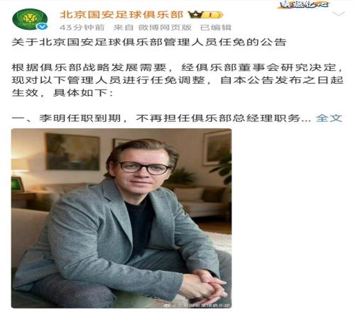 北京时间2025年12月27日消息。2025年即将过去,在获得中超联赛第4名,以及足协杯冠军之后,北京国安的一整年赛程全部收官。今天上午10点,国安官宣:李明不再担任俱乐部的总经理。